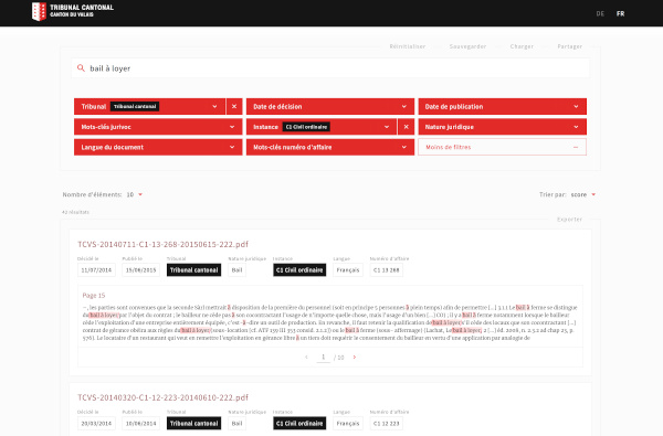 JustSearch is a search platform specialized for legal documents, fully integrated into the court's internal processes and with smart filtering and legislation recognition within documents. It is currently used by the Cantonal Court of Valais for searching in the jurisprudence.